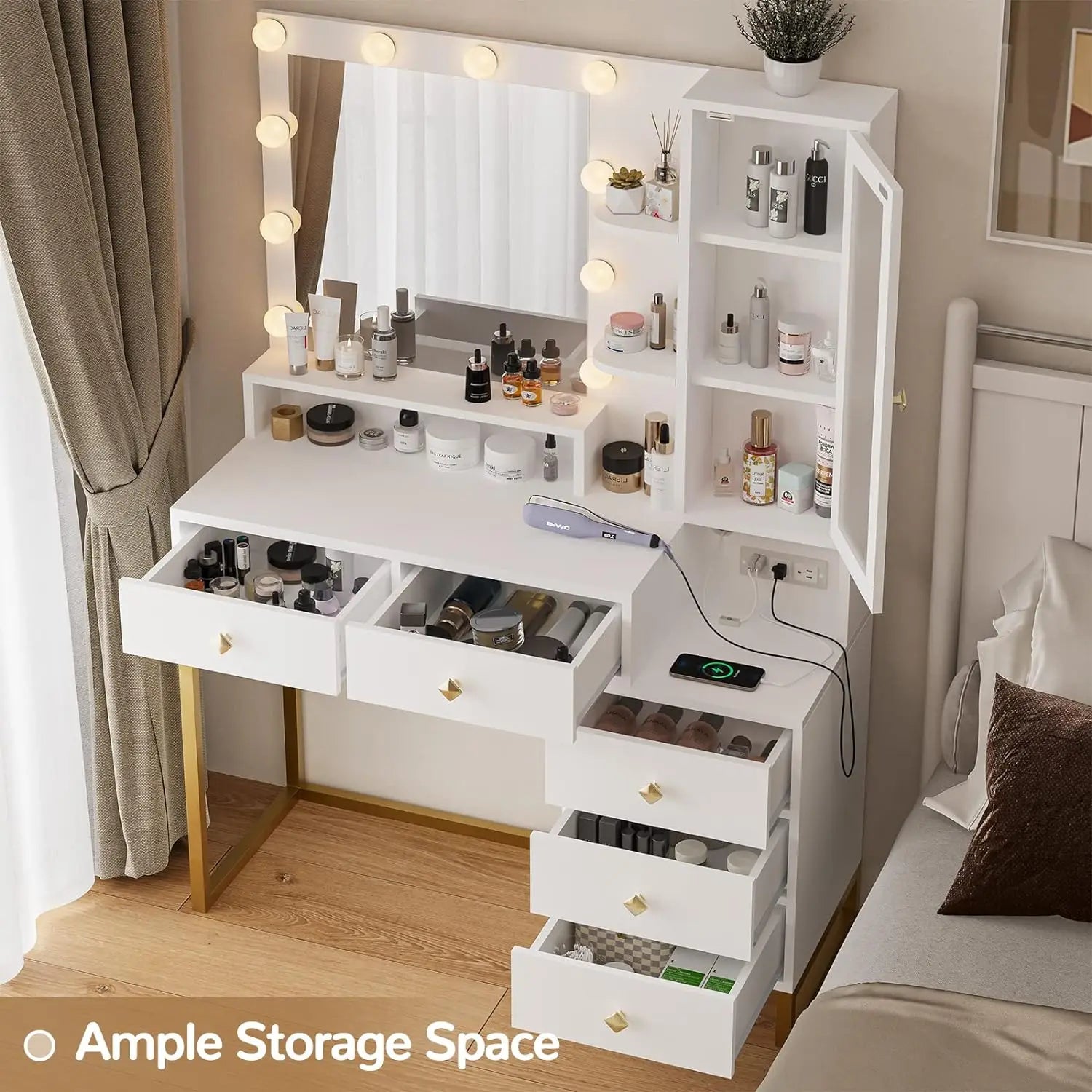 - Large Vanity Desk: Spacious tabletop offers ample room for all your beauty essentials.