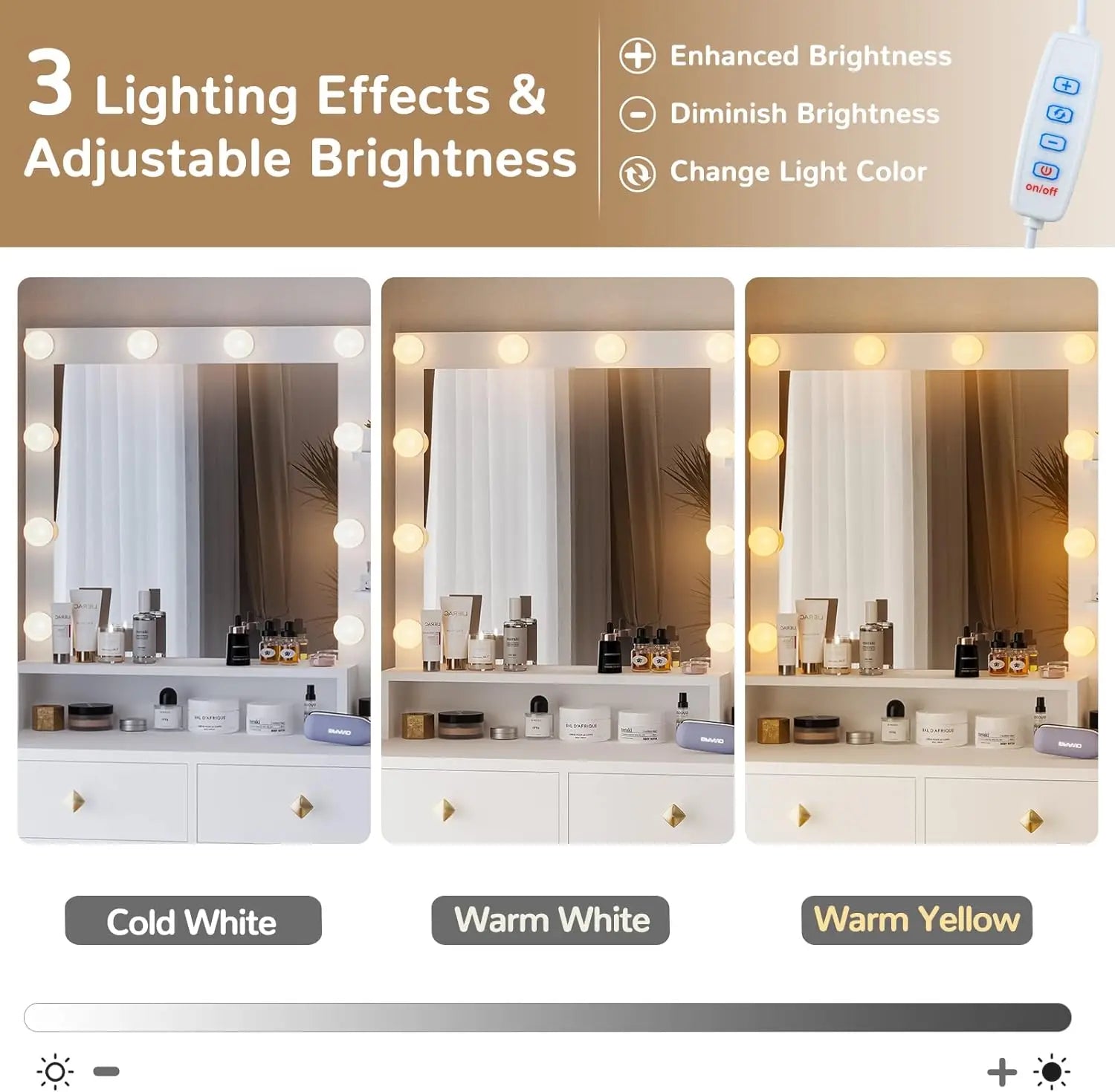 - Mirror with Lights: Built-in lights provide perfect illumination for flawless makeup application.